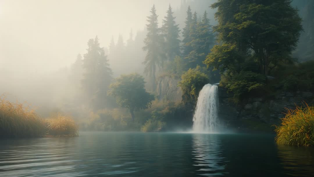 AI Generated Video. Misty waterfall flowing into tranquil lake, bordered by tall pine trees and grassy banks. Rocks subtly form cliffs valued for approachable copy space. Scene versatile for advertisements or marketing nature themes with serene exploration at heart. Appealing to photography, travel, environment content enthusiasts often impressed by stunning vistas.
