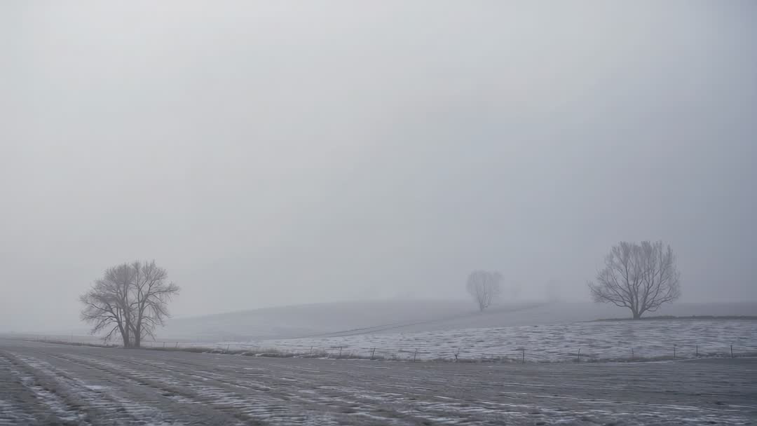 AI Generated Video. Clip showing mist rolling across snow-dusted farmland with three leafless trees receding into thick fog. Wide, slow pan and hold shot emphasizing minimal composition and muted tonal range. Soft contrast and cool gray palette evoking solitude, quiet, introspection. Useful for background plates, title sequences, environmental documentaries, seasonal advertising, meditation and wellness apps, website hero banners, and social media reels. Suitable for layering with text, voiceover, ambient soundscapes, or gentle music. Ideal for conveying cold weather, early morning mood, rural isolation, and atmospheric transitions.