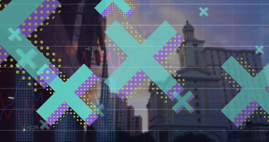This composite illustrates the intersection of modern finance and urban architecture. Solid x-shaped icons and graphs overlay the backdrop of skyscrapers, capturing the pulse of today's business and technology sectors. Ideal for use in articles or presentations addressing financial reports, stock market analysis, and the blending of digital solutions with urban planning.