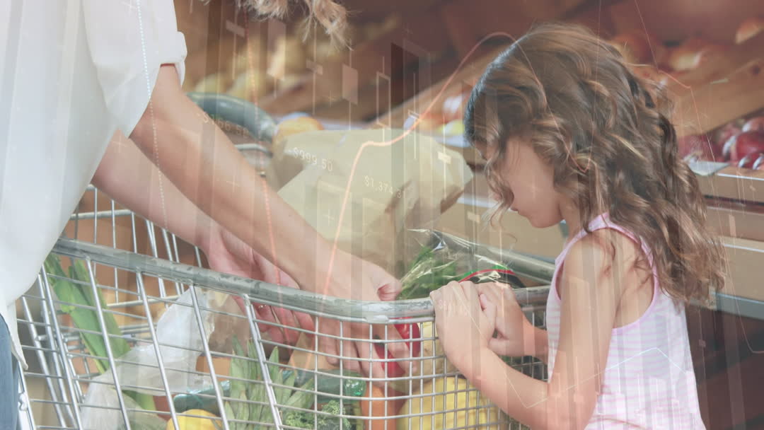 Scene of a mother and daughter shopping in a grocery store with digital overlay of data and graphs. Illustrates technology integration and data analytics in everyday life. Useful for articles on retail trends, family consumer behavior, or advancements in shopping technologies.
