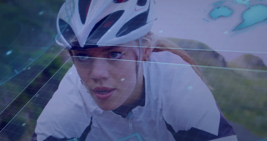 A woman cyclist wearing a helmet appears in combination with a digital overlay of global data and technology graphics. This fusion illustrates the intersection of sports and digital innovation, featuring elements of futuristic technology and real-time data analysis. Useful for advertising campaigns or articles focusing on tech advancements in sports, fitness apps, or the role of virtual reality in physical athletic training.