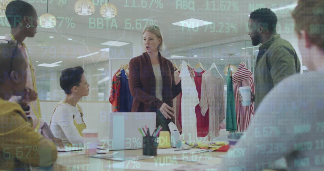 Team gathered in modern workspace discussing strategies related to fashion industry underlaying financial metrics. Ideal for visuals depicting office teamwork, business trends, strategic planning sessions, or diverse workplace environments. Emphasizes collaboration, innovation, and economic focus.