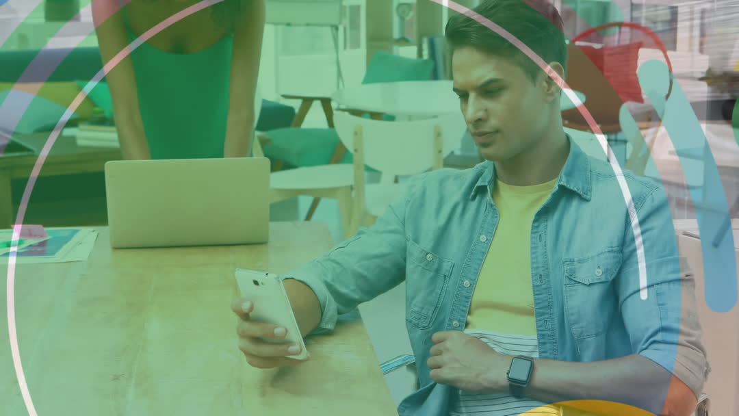 Scene combines elements of professional growth and connectivity, featuring a young man in business casual wear using a smartphone in a modern office setting. Illustrates use of technology for innovative discussions or projects. Suitable for portraying themes of digital business solutions, modern work environments, or teamwork in tech-driven workplaces, as well as understanding and adapting to multicultural concepts.