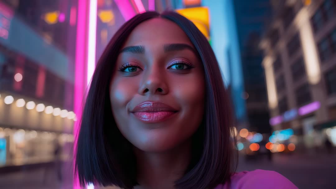 AI Generated Image. Video capturing close-up portrait of model adjusting mirrored sunglasses and checking glossy lips beneath neon city lights. Camera focusing on face, lips, reflective lenses while background dissolving into bokeh. Lighting mixing magenta and cyan for cinematic, high-contrast mood. Skin tones glowing, lip gloss catching highlights, hair framing face for modern, polished aesthetic. Footage suiting beauty and makeup commercial, fashion lookbook, nightlife editorial, social media Reels, website hero banner, music video background, influencer content. Useful for product reveal, brand campaign, lifestyle article, cosmetic packaging motion, tutorial opener. Editing tips: use short loop or slow-motion segment for emphasis, apply light color grade to match brand palette, add lower-third text for call-to-action, pair with synthwave or chill electronic soundtrack for contemporary vibe.