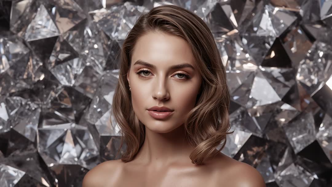 AI Generated Image. Opening frame featuring a female model blinking and tilting head in a studio, flanked by reflective crystal panels. The scene evokes a sense of luxury and modern sophistication, perfect for use in promotions for fashion, beauty industry adverts, or editorial content highlighting elegance and style. The geometric and abstract backdrop enhances content focused on contemporary aesthetics and innovation.