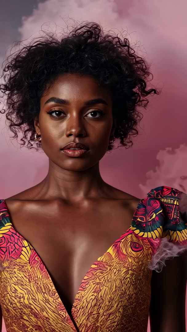 AI Generated Image. Vertical fashion clip showing model posing and holding pose while camera zooming in to highlight gold textured gown, glowing skin, and natural curls against soft pink smoke backdrop. Composition balancing close-up facial portrait and bodice detail, capturing fabric texture, subtle makeup, and poised expression. Use for high-end fashion campaign, beauty or cosmetics launch, haircare promotion, couture lookbook, and luxury branding. Use as social media reel, Instagram story, TikTok ad, or vertical hero for e-commerce showcasing texture and fit. Suggest slow elegant zoom, warm color grading, gentle vignette, and ambient music or minimal voiceover to enhance cinematic mood. Suitable for editorial spreads, runway promotion, makeup tutorials, and textile or accessory detail highlight.