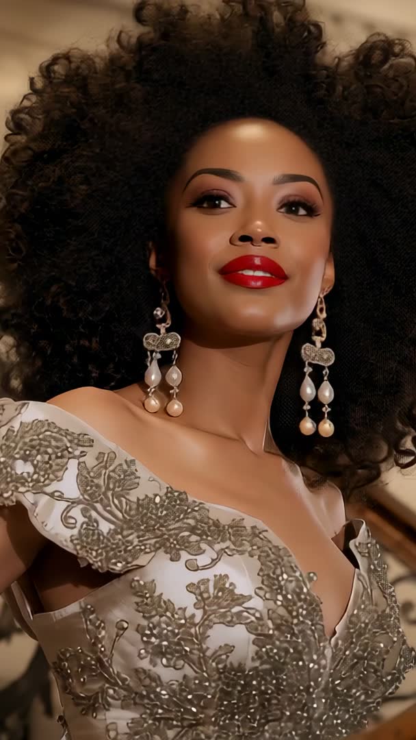 AI Generated Video. Video capturing model turning on cue, smiling in ornate beaded couture gown and dangling pearl-drop earrings while posing on grand staircase in luxurious foyer. Close-up portrait framing highlighting glossy red lips, flawless skin, dramatic eye makeup, and voluminous natural hair texture. Sequence featuring subtle head turn, confident gaze toward camera, and slow-motion movement, delivering cinematic glamour mood. Working well for luxury fashion campaigns, beauty and jewelry advertising, couture editorials, bridal inspiration, and red carpet promotion. Vertical framing making ideal for mobile-first content, Instagram Reels, TikTok, Snapchat Spotlight, and in-app ads. Editing suggestions including adding soft vignette, warm color grade, gentle slow-motion, and cinematic soundtrack to enhance high-fashion atmosphere. Licensing ideas including hero clip for campaign openers, cutaway beauty shots for commercials, and product-focused inserts for earring or makeup showcases.
