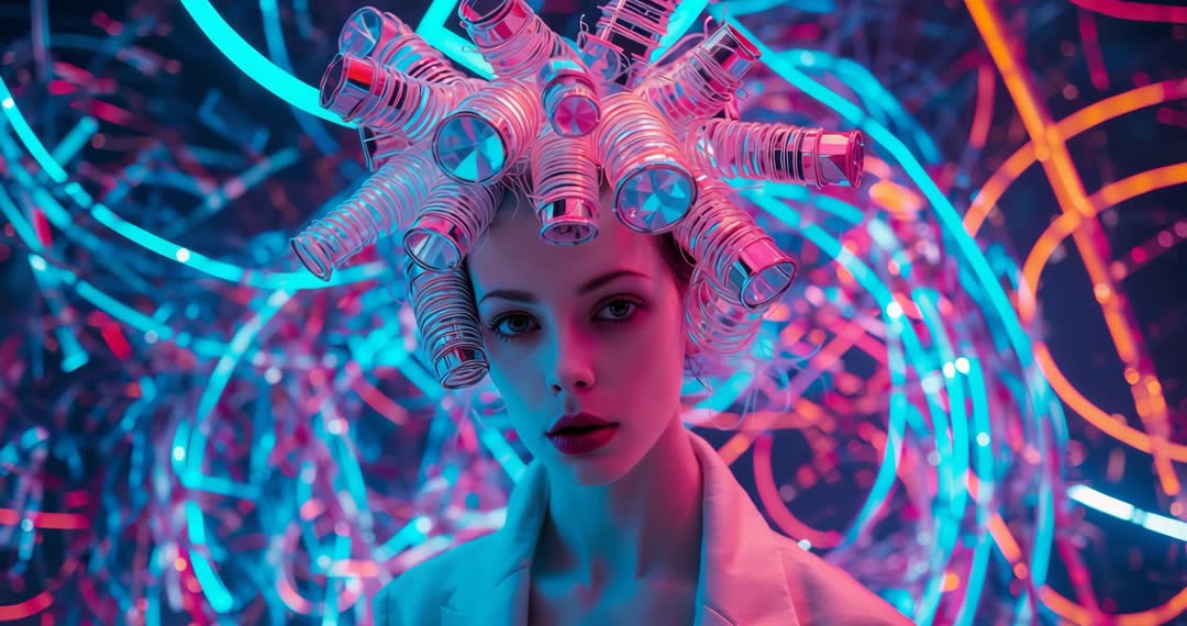 - Model Wearing Coil Headpiece in Neon-Futuristic Studio