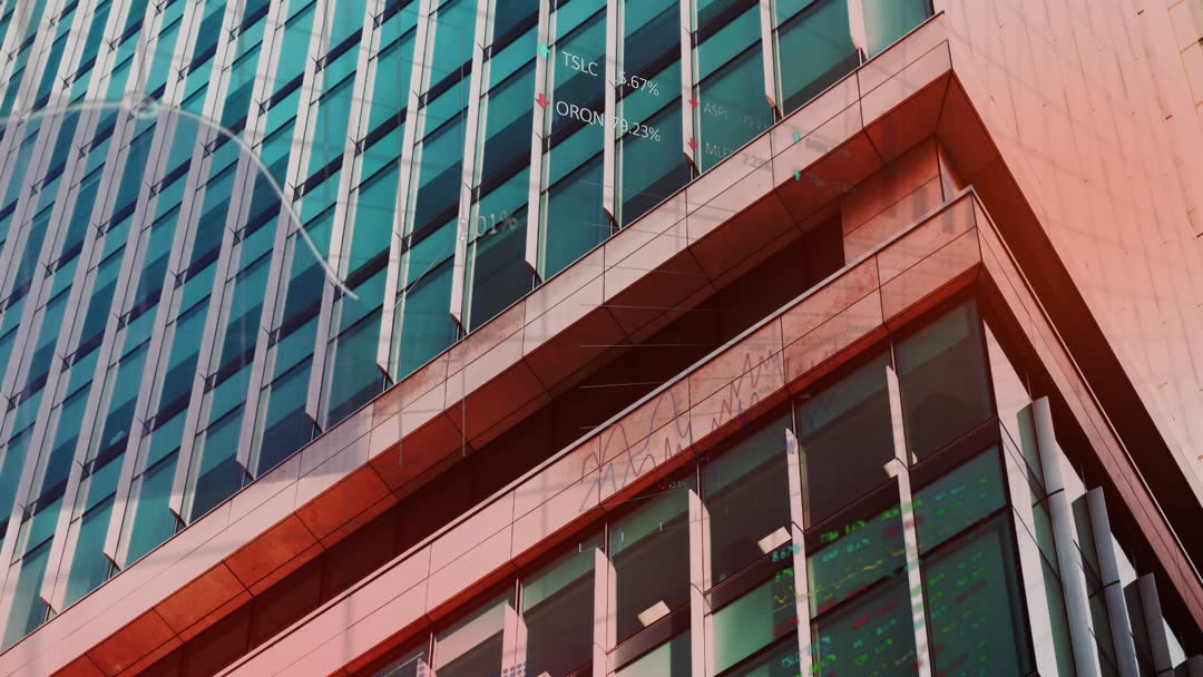Impressive angled view of a modern corporate skyscraper with a digital data overlay. The integration of business data elements over the building's glass facade highlights technological advancements in finance and urban development. Ideal for use in business presentations, financial analyses, urban development discussions, and marketing materials showcasing technological integration.