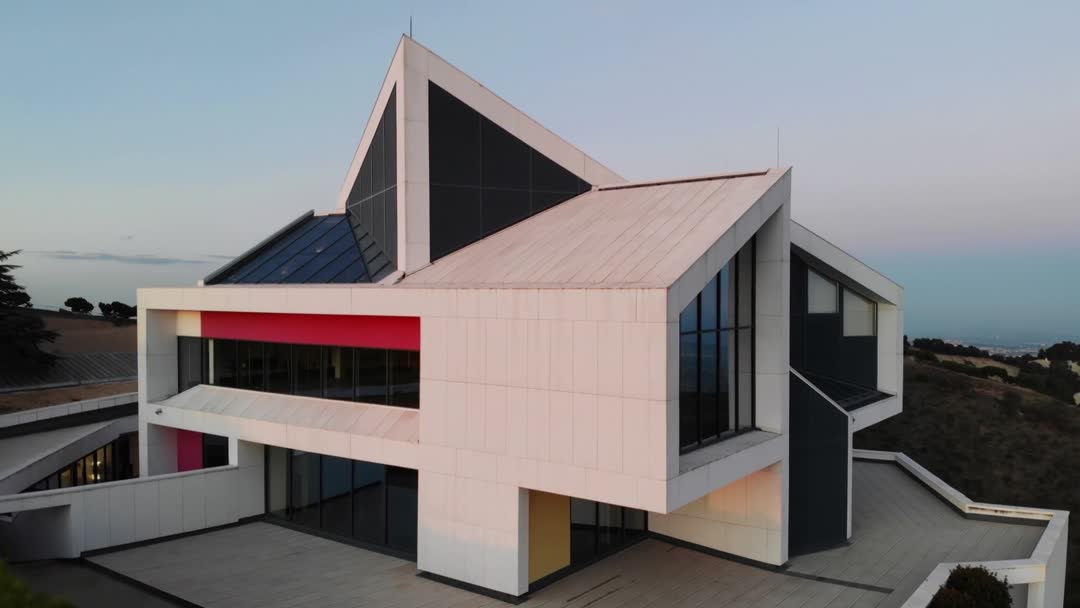 AI Generated Image. Video shows a modern architectural house located on a hillside during dusk, captured from a low afternoon light by a panning drone. The structure illustrates minimalist design with prominent black and white panels, large geometric windows, and elements of red-enhanced balconies that contribute to the aesthetic contrast against the tranquil evening sky. This video could be used for showcasing cutting-edge architecture, exploring minimalist landscape designs, or promoting the use of aerial technology in the real estate industry for advanced home tours, property turndiffs or construction advertisements.