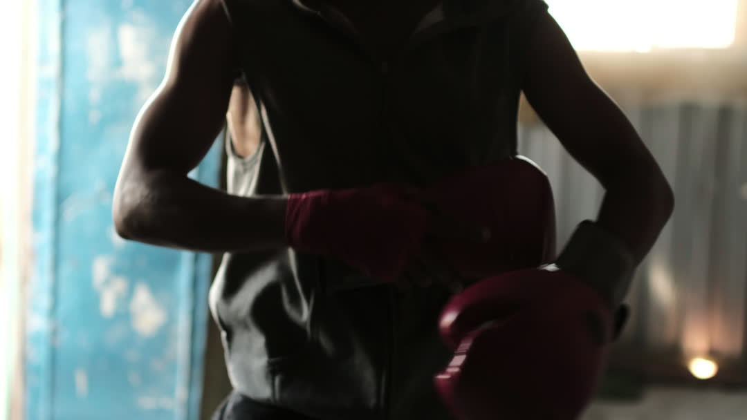 Dark silhouette of a strong athlete removing boxing gloves in a gym setting captures a sense of strength and focus. Perfect for use in fitness posters, sports magazine articles, or advertisements related to boxing or athletic gear.