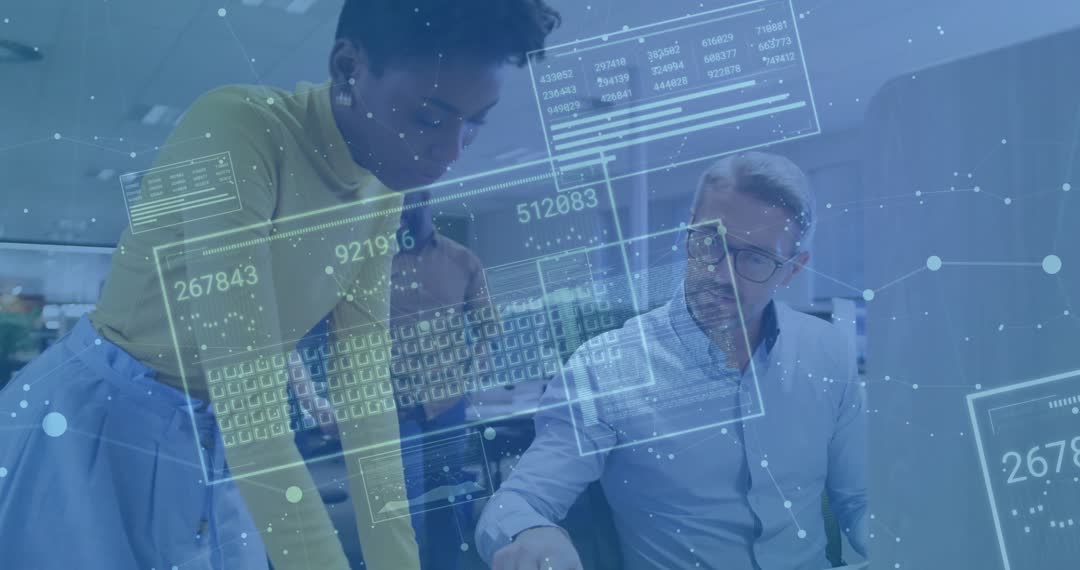 Two professionals in an office collaborate on a report, overlaid with dynamic digital interface representations, emphasizing teamwork and modern data analysis practices. This visual underscores themes of innovation and productivity. Ideal for illustrating concepts related to business analytics, effective collaboration, and the implementation of technology in professional environments.