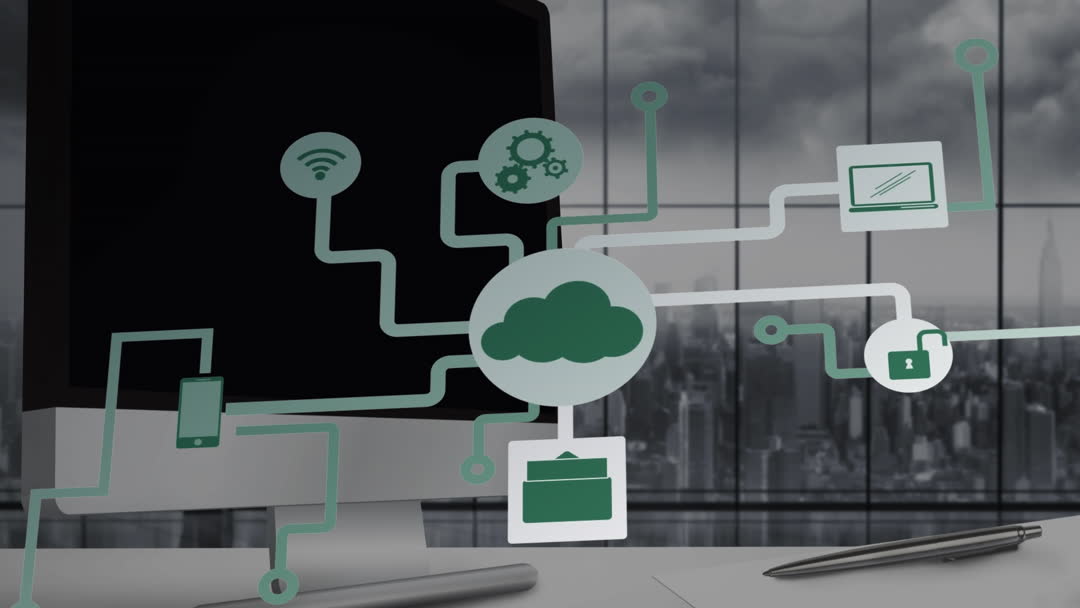 Animated tech icons, including network and cloud computing symbols, projected over a desktop computer display in an office environment. Useful for illustrating concepts of business data processing, technology integrations, and communication networks. Ideal for use in corporate presentations, tech industry content, and innovation-related media.