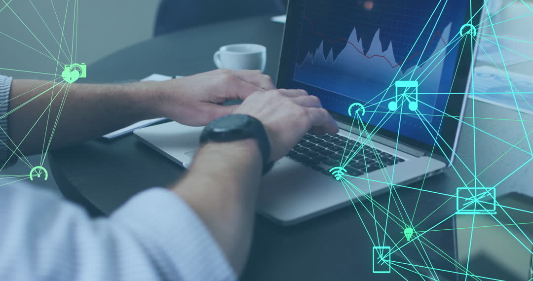 Businessman sitting at office desk typing on laptop with digital connections infographic overlay. Screen displaying financial data charts. Useful for illustrating concepts of modern business, technology integration, digital networking, data analysis, wireless technology, fintech, and corporate environments.