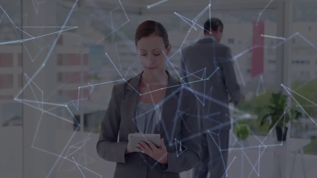 A businesswoman interacts with a tablet in a contemporary office space, overlaid with futuristic network graphics. This video emphasizes themes of connectivity and digital transformation in the corporate world. Suitable for use in content related to modern businesses, innovation, collaboration technologies, and professional work environments.