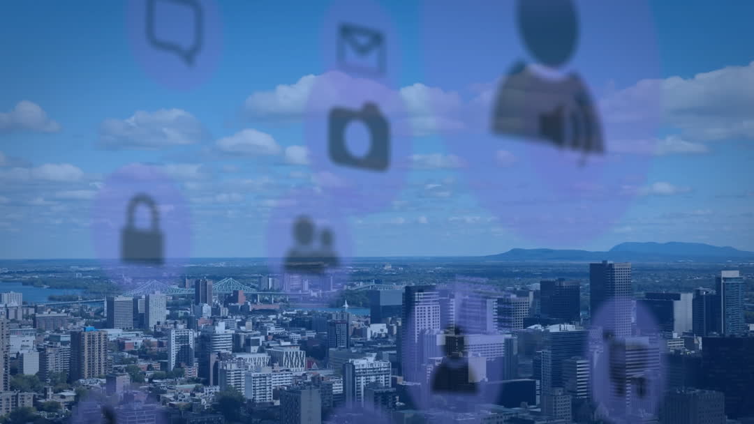 Modern Cityscape with Digital Communication Icons Overlay Video