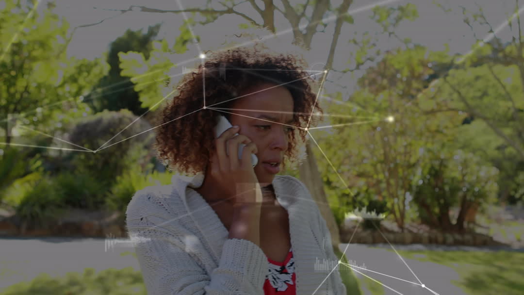 Scene depicts African American woman using smartphone outdoors with abstract network connection overlay, symbolizing digital communication. Ideal for illustrating tech themes, social media concepts, or articles on modernization in communication.