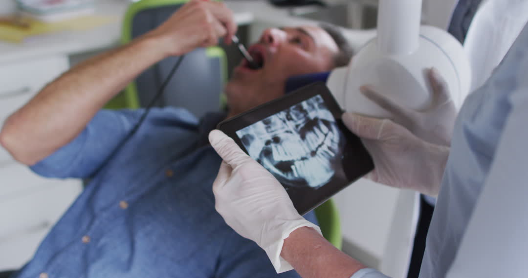 Dentist wearing gloves examines patient's teeth using advanced dental technology. X-ray on tablet shows detailed scans of patient's teeth and jaw, demonstrating the integration of digital tools in modern dentistry. Useful for depicting healthcare environments, dental tools, and illustrating cutting-edge practices in dentistry.