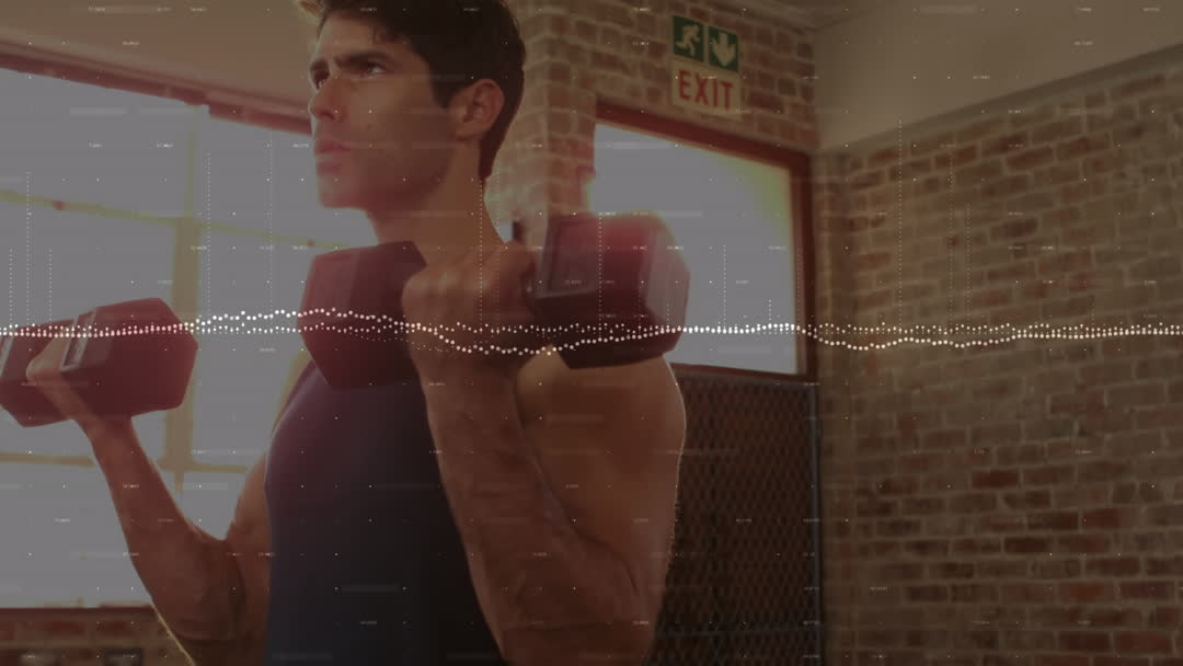 A young man lifting weights is digitally linked to analytical data overlays, symbolizing modern training intertwined with technology sophistication. Perfect for use in themes of fitness tech innovation, modern gym solutions, or emphasizing the cutting-edge integration of physical and digital elements. Highlights trends in seamless integration between exercise routines and technology-assisted analytics.