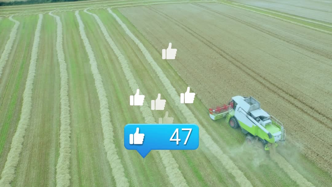 This scene captures a birds-eye view of a combine harvester efficiently working in a vast field, illustrating the integration of digital elements with traditional agriculture. The inclusion of thumbs-up icons suggests the importance of social media and technology advancements in modern farming. This could be used in articles about precision agriculture, the role of machinery in farming, or the intersection of digital platforms with agricultural practices.