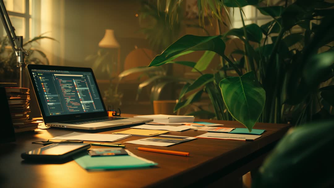 AI Generated Image. Organic home office environment featuring a stylish desk with a laptop displaying coding software and a nearby smartphone. Ideal video frame for showcasing a serene workspace aimed at productivity and creativity. Incorporates green plants for a natural and calming atmosphere. Suitable for use in promotions related to remote work, software development, or creating inspiring workspaces.