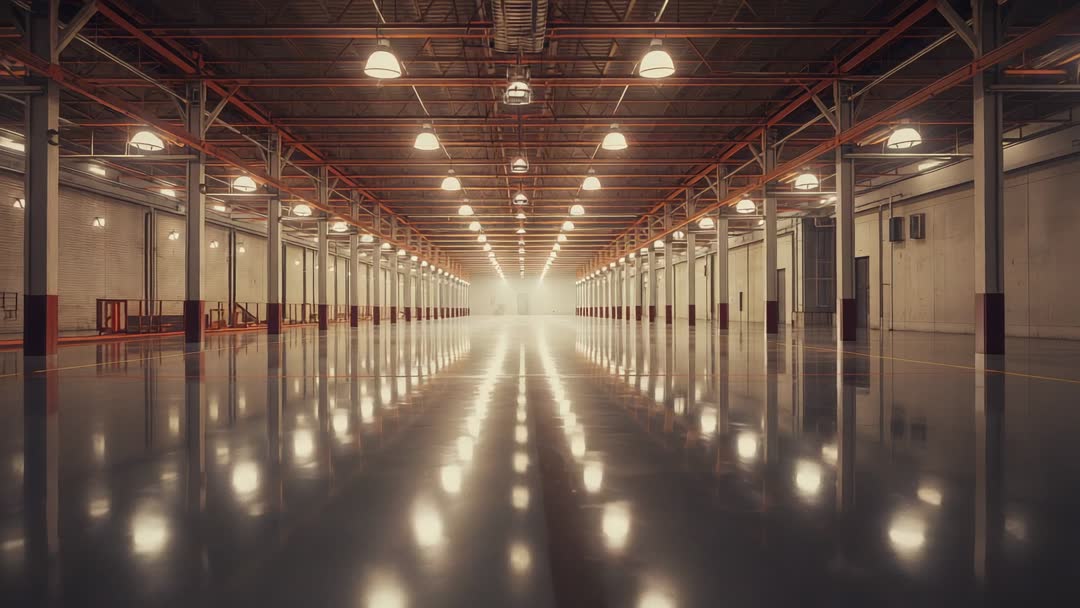 - Modern Industrial Warehouse with Gleaming Floor and Pendant Lights