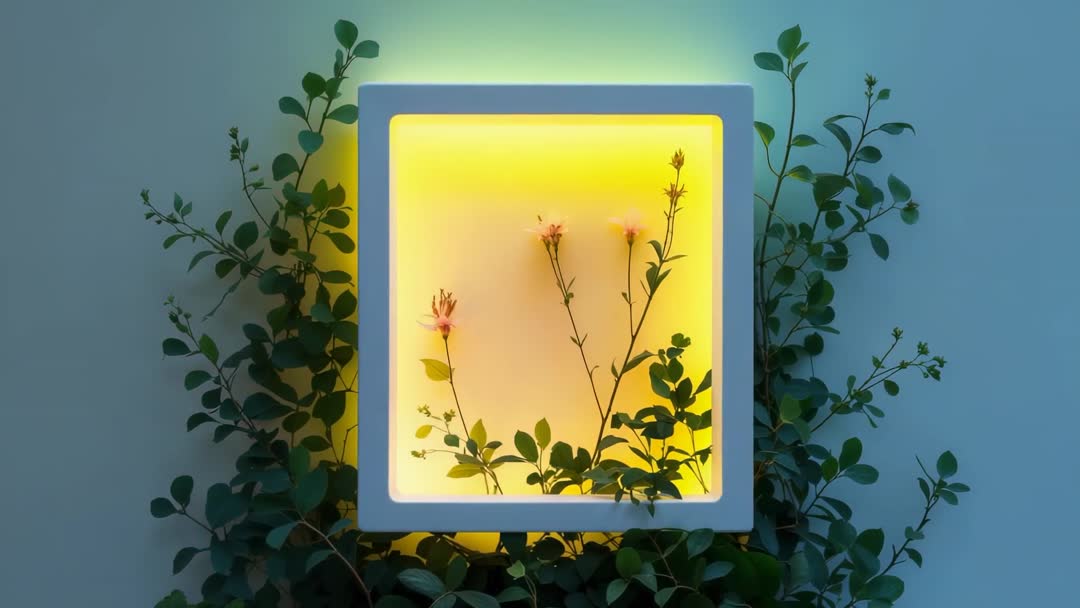 AI Generated Image. This video depicts a modern LED panel elegantly merging with climbing plant stems, creating a unique ambient effect. Its gradient lighting shifts from pink to green to yellow, enhancing the modern aesthetic. Ideal for promoting home decor, smart lighting solutions, or interior design inspiration, this suggests innovative blend of technology and nature to create stylish, energetic interior spaces.