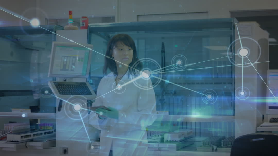 This video depicts a female scientist in a laboratory, connected through a network of digital interface elements highlighting advanced medical technology. Perfect for use in content related to technological advancements in healthcare, digital science processes, research and innovation sectors, or diversity in STEM fields.