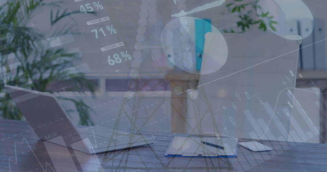 Depicts a modern office setting with laptop, clipboard, and phone overlayed with transparent statistical graphs and telecommunications towers. Conveys themes of business analytics, digital transformation, and technological innovation. Useful for illustrating articles on modern business practices, statistical data analysis, or advances in telecommunication and networking industries.