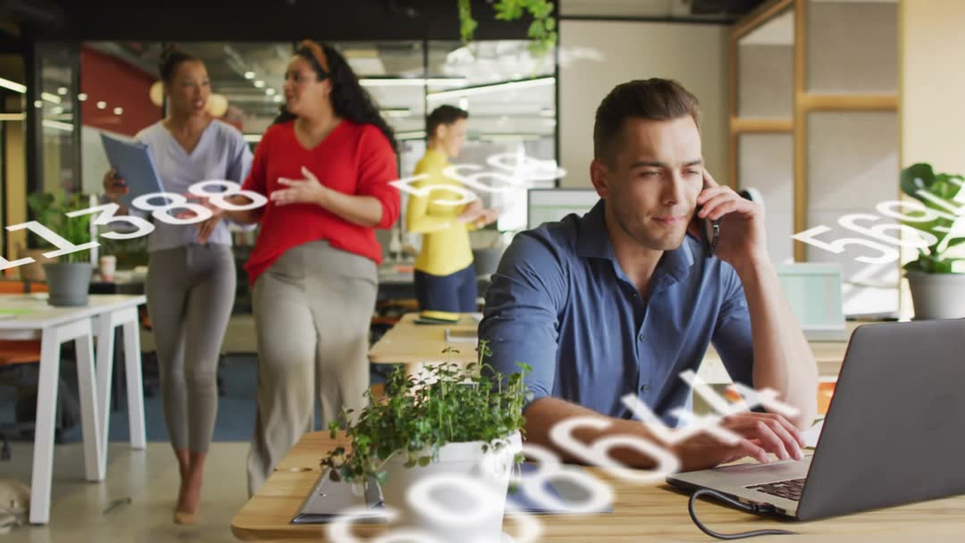 This visualization showcases a modern office environment with a male coworker handling a phone call while working on a business plan. In the background, colleagues engage in discussions, walking swiftly and carrying documents. Superimposed numbers symbolize digital data integration and innovative business processes. This visual can be ideal for illustrating themes of teamwork, productivity, and communication dynamics in contemporary work settings, suitable for business articles, promotional materials, or digital transformation projects.