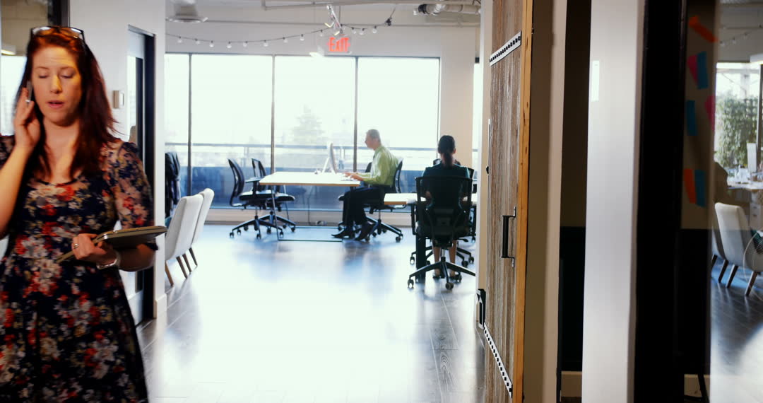 Businesswoman is walking while talking on a mobile phone as coworkers work in the background. The open-concept office has large windows, natural lighting, and a contemporary design. This video is perfect for showcasing a dynamic work environment, highlighting teamwork and communication in modern corporate settings, or illustrating concepts of business productivity and organization.