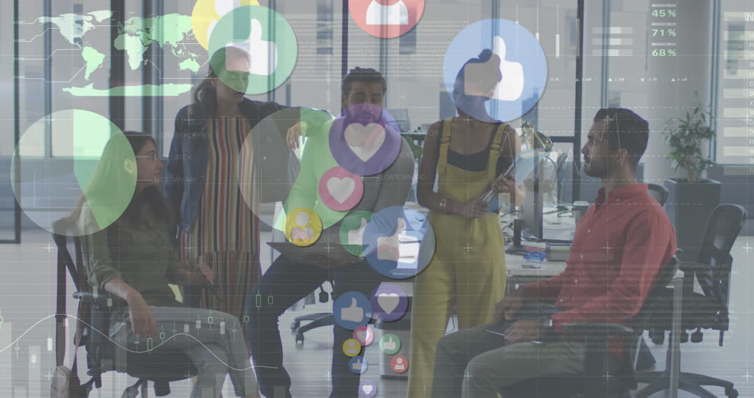 A diverse group of office colleagues discussing business strategies in a modern workspace, with holographic data elements such as like icons and statistics overlaid on the scene. Useful for illustrating concepts of teamwork, digital collaboration, futuristic workplace environments, or integrating modern technology into professional settings.