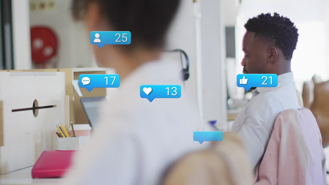 Animated digital overlay showcases social media engagement icons over colleagues interacting in modern office workspace. Ideal for illustrating themes like social networking in professional environments, digital communication efficiency, and modern workplace dynamics. Useful for presentations, articles on technology impact at work, and marketing strategies centered around online interactions.