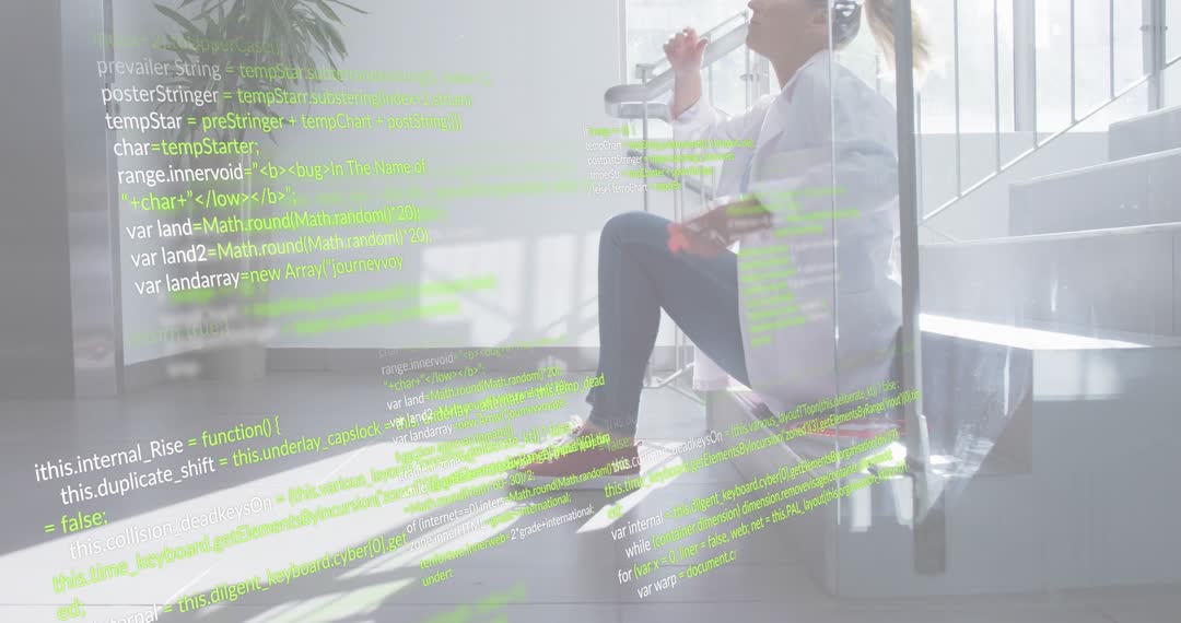 Video depicts a professional woman in business attire taking a restorative stroll in a sleek office environment. Digital algorithms and computer code flow seamlessly across the foreground, highlighting technology's influence on the modern workspace. This content is ideal for illustrating themes like innovation in workplace wellness, tech-infused environments boosting productivity, or personal self-care within professional settings.