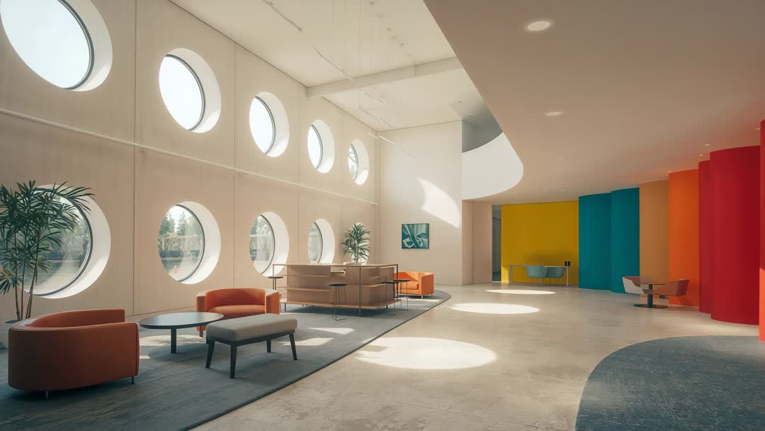 - Modern Reception Area with Circular Windows and Bold Color Panels