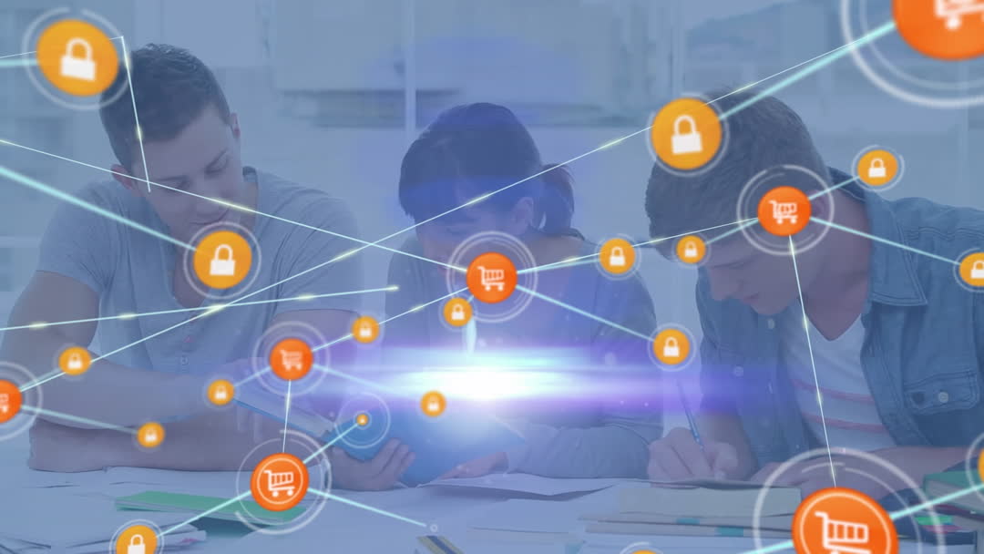 This visual combines elements of advanced technology and teamwork, portraying young employees collaborating with digital retail icons overlay. Suitable for depicting themes of e-commerce, digital security, and networking in business presentations, educational content related to technology adoption in workspaces, and articles on the future of retail.