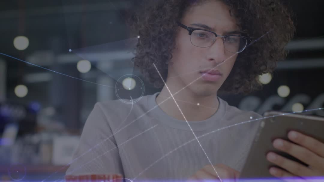 Young man deeply focused while interacting with advanced digital interface, suggesting profound integration of technology in daily life and work environments. Dynamic visuals of animated nodes imply high-tech network concepts crucial for professionals in digital industries. Useful for themes surrounding technological innovation, connectivity at work, or depicting the evolution of digital landscapes.