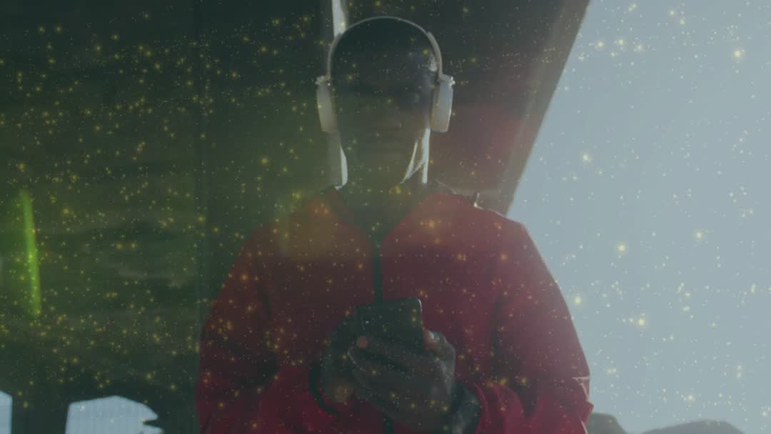 Perfect for illustrating the theme of modern technology in urban settings. Showcases youth, connectivity, and the fusion of digital elements in everyday life. Ideal for use in advertisements or content related to technology, music, or urban lifestyle.