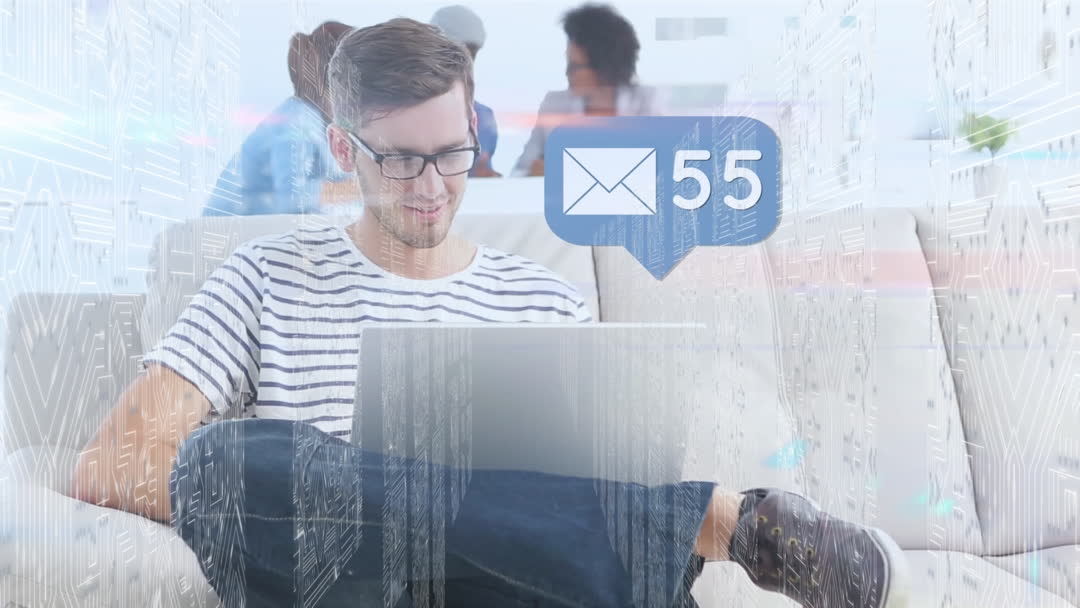 Caucasian male sitting on couch using laptop, focusing on work with digital email icon overlay. Represents modern office technology, remote work, and effective business communication. Suitable for articles on tech-driven workspaces, productivity tips, or advertisements for email management tools.