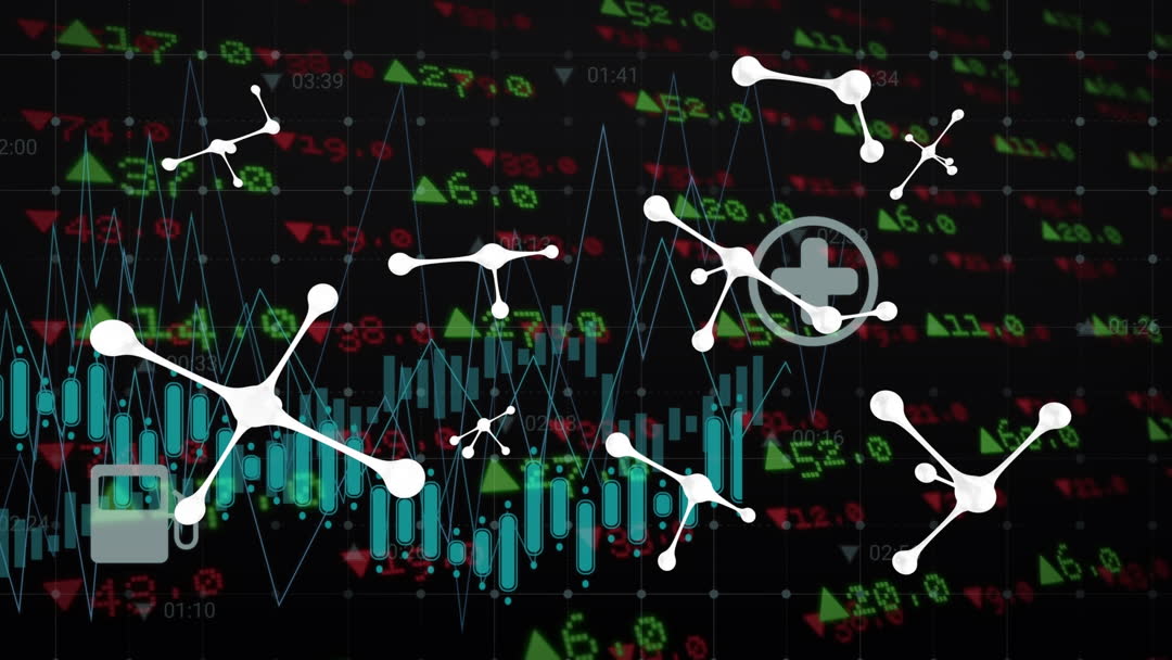 Creative visualization blending digital representation of molecular structures and stock market data. This visual can be useful for articles or presentations that discuss economic influences on the medical research sector and the intersection of finance and biotechnology. Ideal for illustrating concepts related to financial projections in scientific research advancements.