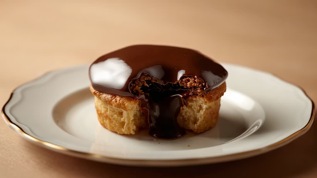 AI Generated Image. Video showing molten chocolate tart splitting open, glossy ganache flowing over flaky pastry onto vintage gold-rim plate. Tight macro framing and warm creamy background creating inviting, indulgent mood. Perfect for use in dessert menu hero, bakery website banner, social media ad, recipe tutorial, culinary blog header, packaging art, promotional video, branded content. Useful for slow-motion footage, close-up cutaway, before-and-after recipe sequence, product launch teaser. Colors and texture highlighting rich chocolate sheen and flaky crust, leaving space for headline or logo placement in upper-right quadrant.