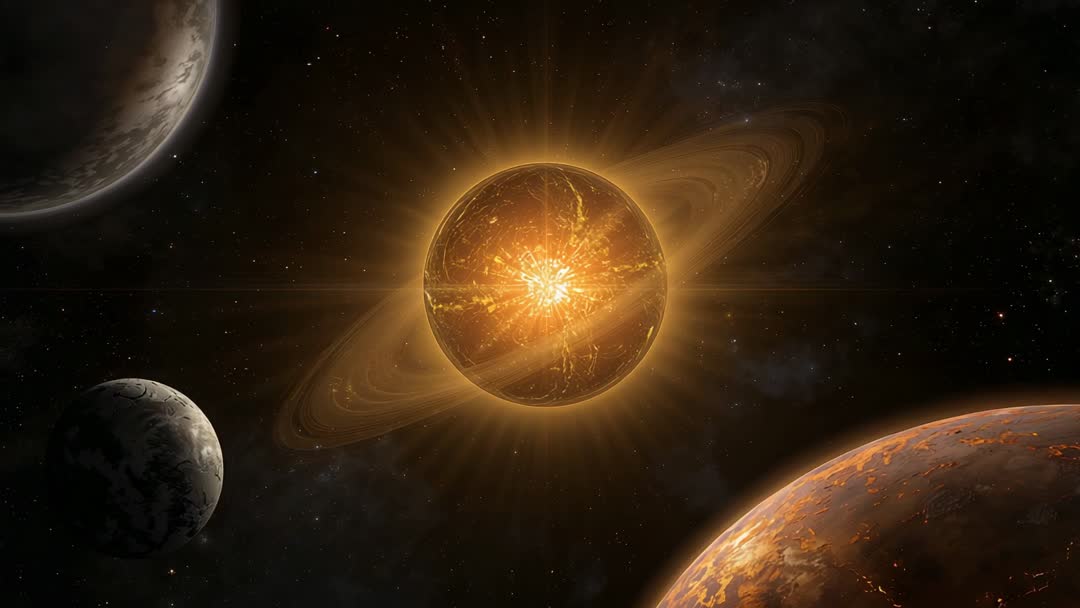 AI Generated Image. This video captures a glowing molten star with magnificent rings sending energy waves through the deep expanse of space. Surrounding the star are several rocky planets, adding to the interstellar grandeur. Ideal for use in science fiction themes, astronomy documentaries, or AI-generated content exhibitions, this visually arresting scene conveys mysteriousness of the universe.