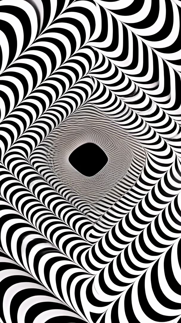 AI Generated Image. Vertical video showing monochrome optical tunnel with repeating arcs spinning and pulsing toward center, creating hypnotic motion and strong sense of depth. High contrast black and white stripes forming geometric spiral, offering bold visual rhythm and minimalist composition. Smooth loopable motion ideal for social media reels, short-form vertical ads, music video backgrounds, live VJ visuals, screensavers, and app intros. Useful for creative projects needing retro op art vibe, trance-like ambience, or attention-grabbing background. Editing suggestions: adjust playback speed to match soundtrack tempo, apply color overlays or gradient maps for mood shift, add subtle zoom or vignette for extra depth, and use as transition layer or masked element for titles and branding.