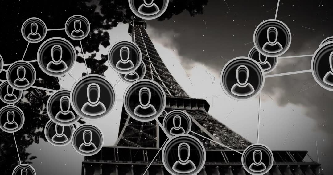 Illustrates concept of networking with user icons interconnected over Eiffel Tower backdrop. Emphasizes idea of global communication and data exchange. Suitable for depicting technology industries, international connections, or digital services in presentations or content about globalization.