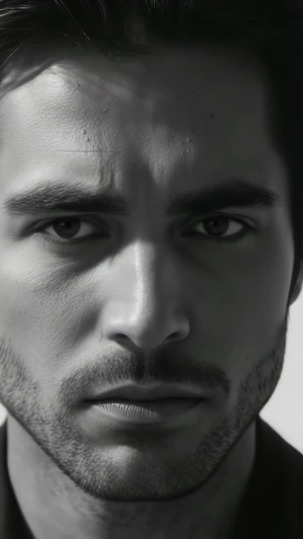 AI Generated Image. Close-up monochrome vertical video showing male model shifting expression while holding intense gaze. Moisture beads on forehead and fine skin texture highlighting natural stubble and pore detail under dramatic studio lighting. Footage conveying tension, introspection, raw masculinity, suiting fashion, grooming, skincare, and film projects. Video working well for social media reels, app hero banners, commercial campaigns, casting reels, and short film sequences. Space at top or bottom for text overlay and headline; cropping easily for square or landscape formats for editorial spreads and advertising layouts.