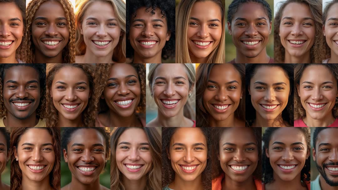 Montage Showing Smiles and Skin Tone Transitions in Diverse Headshot Grid Video