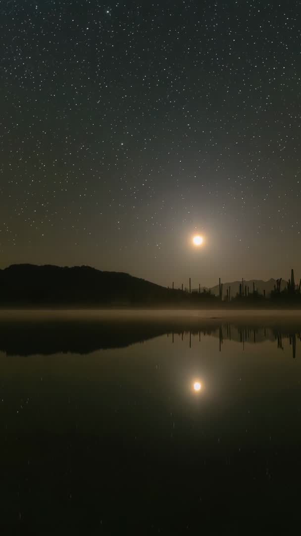 - Moon Rising Over Desert Lake Reflecting on Still Water with Cactus Silhouettes Vertical Night Video