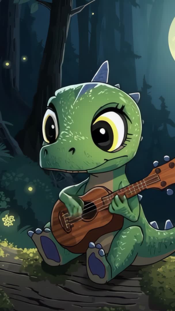- Moonlit Baby Dinosaur Playing Ukulele on Log in Enchanted Forest | Vertical Video Loop