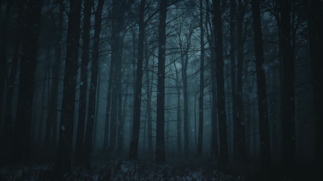 AI Generated Video. Clip showing moonlit pine forest at night with thick fog drifting between tall trunks and snowflakes beginning to fall. Camera dolly-panning slowly forward, revealing deeper rows of tree silhouettes and building suspenseful, cinematic mood. Color palette favoring cold blue tones and deep shadows, creating somber, mysterious atmosphere. Serving as opening sequence for thriller, horror, mystery projects, nature documentary scenes, or seasonal advertising for winter apparel and outdoor gear. Working well for title cards, social media teasers, website hero banners, book trailers, podcast backgrounds, or ambient loops for film scoring and sound design tests.