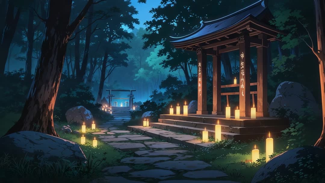 AI Generated Image. A serene video scene showcasing a moonlit forest glade with swaying trees and flickering candles illuminating the stone pathway leading to a shrine. Features a traditional torii gate suggesting Japanese spiritual influence. Ideal for themes related to meditation, spirituality, tranquility, and mystical experiences. Suitable for video projects focusing on nature retreats, mindful living, cultural rituals, or relaxation.
